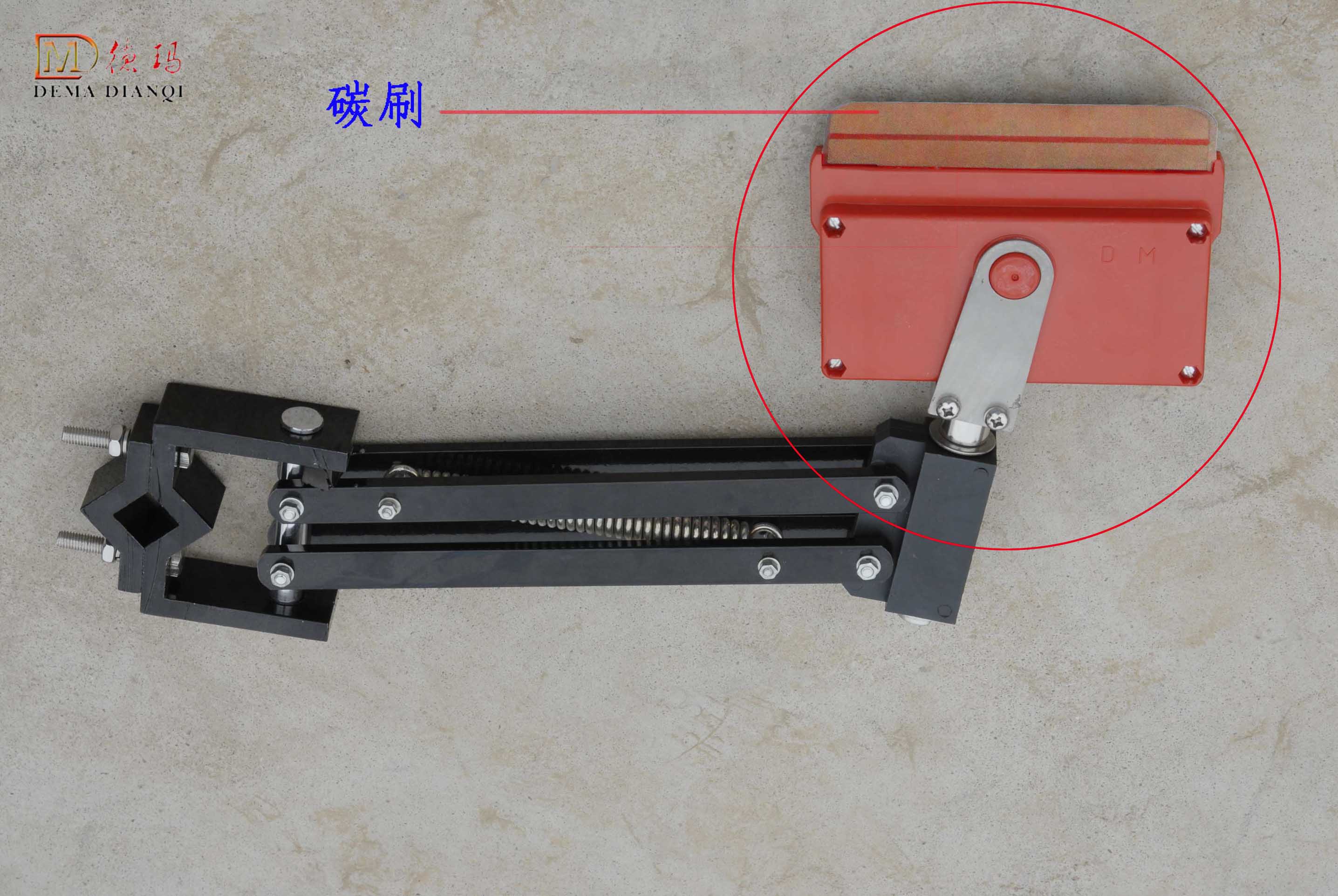 很明顯,客戶購買的重型集電器不是德瑪?shù)?,而是購買的假冒德瑪集電器,以上箭頭標(biāo)注位置明顯與濟(jì)南德瑪生產(chǎn)的集電器不一樣,首先,重型薛片,濟(jì)南德瑪生產(chǎn)的有磨損警戒線;其次,集電器旋轉(zhuǎn)桿位置,濟(jì)南德瑪生產(chǎn)的不是彈簧,而是實心鋼圈;再次,假冒德瑪集電器支架桿上面是4個螺栓2根彈簧,濟(jì)南德瑪生產(chǎn)的支架桿是3個螺栓1根彈簧。同時,該假冒德瑪集電器在紅色薛盒上面,用磨砂出了DM字樣,以此蒙混客戶。正宗濟(jì)南德瑪集電器如下: