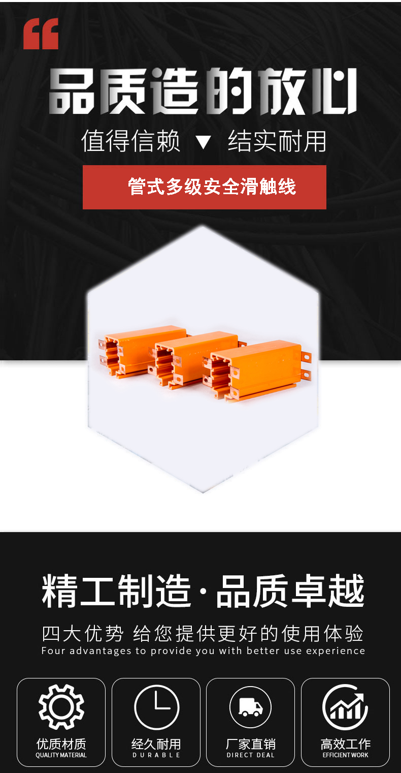 DMHP型管式多極安全滑導(dǎo)線采用高分子聚氯乙烯外殼,內(nèi)嵌多條輸電銅導(dǎo)體作為輸電母線,配置移動靈活的多極電刷集電器,其結(jié)構(gòu)簡單緊湊、安全可靠、安裝維修方便。 由銅代替鋼作為輸電導(dǎo)體,可節(jié)約電能15%~20%,且大大節(jié)省材料和安裝費用。 現(xiàn)泛應(yīng)用于廠礦、庫房、車站、港口碼頭的起重機(jī)械,如電動葫蘆、梁式和橋式起重機(jī)、電梯、自動化生產(chǎn)線和其它移動的用電設(shè)備.