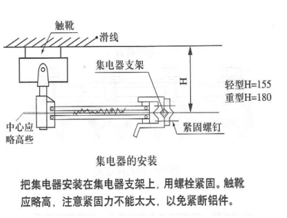 當(dāng)滑觸線及配套件安裝完成后,即可以安裝集電器,按照高度尺寸H(支架中心到滑靴上平面的高度)。和觸靴端中心略高一些的要求,確定集電器支架在移動(dòng)方向上的安裝位置。如圖: